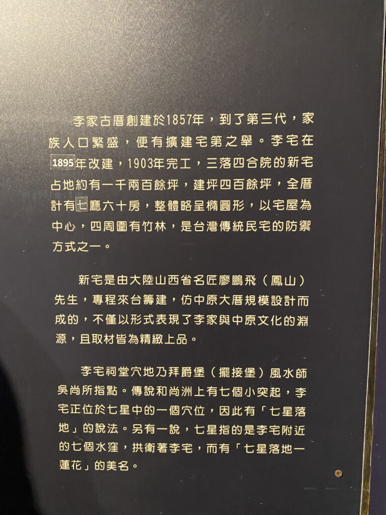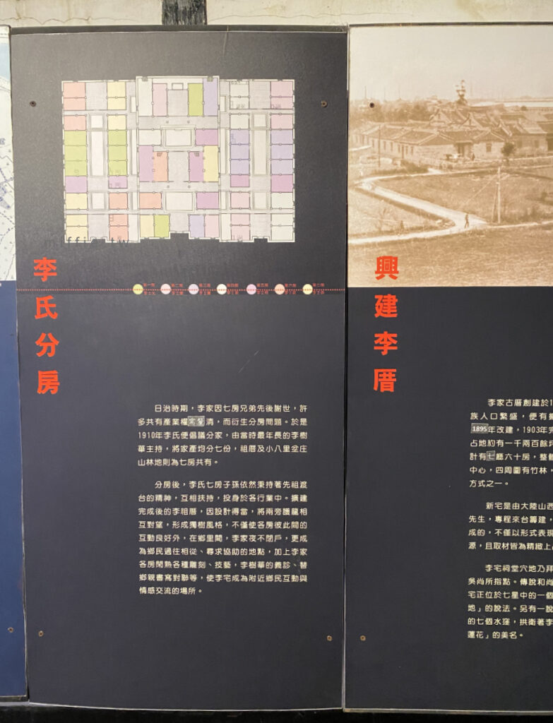 看過幾間差不多時期的豪宅,大多的「故事」都很像,就某一個人因為務農的阿公很重視教育,然後努力養育下一代,成群的孩子其中一人從商致富有了比較多的資源,就叫下一代要努力讀書,然後還有人真的考中舉人什麼的,要不就是就當醫生或鄉長(從政),反正就是社會地位高的職業,接著就抗日(李將軍),然後再接下來就…不好說了,深坑的黃家、霧峰林家也是差不多軌跡,我發現這些可以留下來成為三級古蹟的古厝,多半都有抗日事蹟,大概是這樣的故事,很符合中華民國的需要。