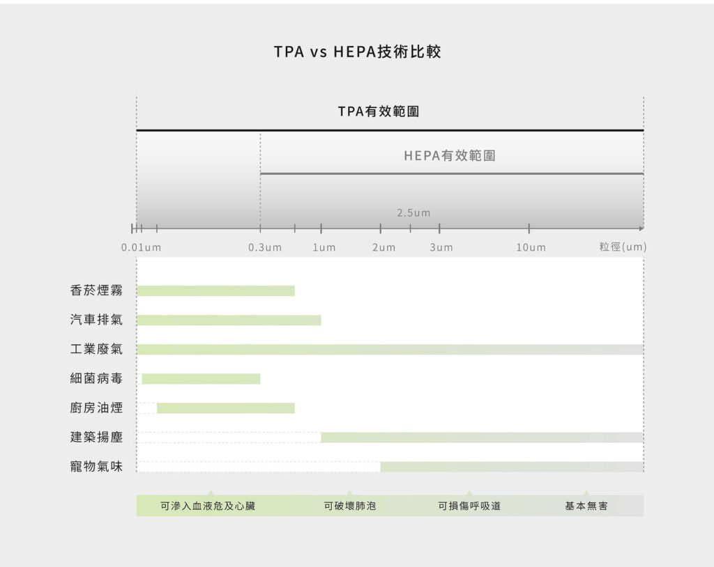 當初會選擇這台的原因除了不用一直買新的濾網來換之外,還有一個就是他們強打他們的TPA雙極獵塵技術過濾空氣的有效範圍比HEPA濾網還要好。其實我不是很懂,因為HEPA濾網不就是醫院常在用的空氣清淨濾網嗎?只是想到新冠病毒的尺寸就是我本來那台空氣清淨機到不了的尺寸,所以就決定換這台試看看了。